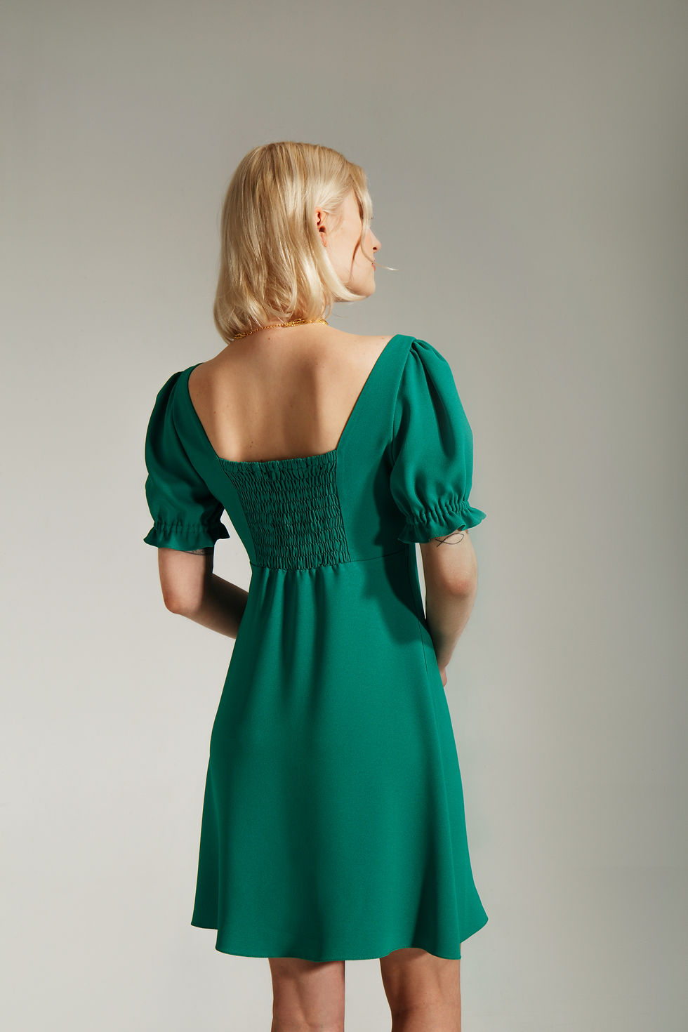 A feminine dress designed with soft structure, delicate gathering, and an effortlessly elegant silhouette.